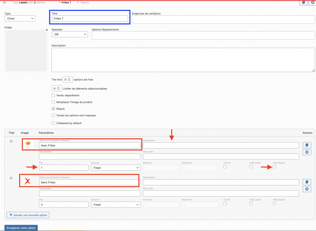 Remarque : sur le ticket de caisse, seul le nom de d’option est indiqué. Il faut donc être le plus précis possible pour le client et en cuisine.