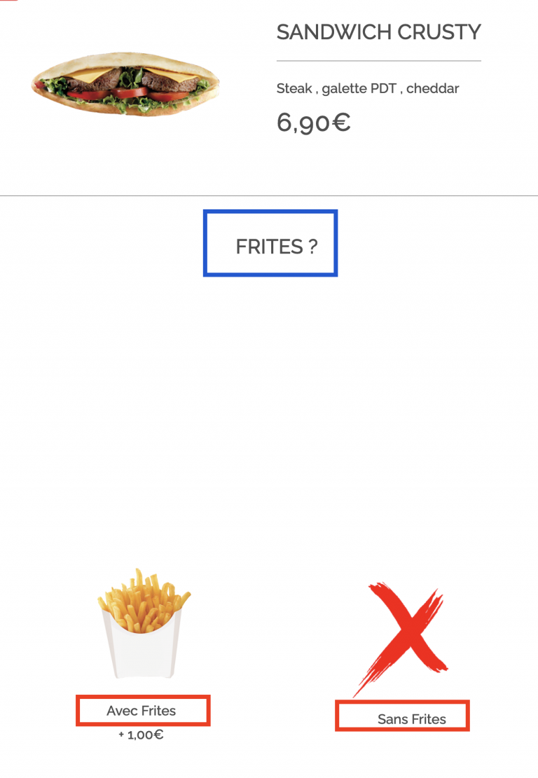 Ces données encadrées en bleu et en rouge doivent être remplies pour être affichées sur la borne. Les données dans le cadre rouge sont celles indiquées sur le ticket de caisse et l’écran cuisine. ça doit donc être explicite (exemple : ne pas mettre oui / non, mais « avec frites »).