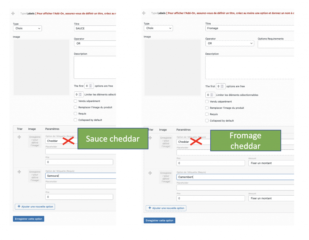 Pour éviter d’être perdu sur le tickets, si vous avez 2 produits différents, il faut bien les démarquer comme sur l’exemple ci-dessous. Si on laisse Cheddar dans les 2 groupes, on aura sur le ticket par exemple : Burger, cheddar, cheddar. On ne pourra pas différencier si c’est la sauce ou le formage